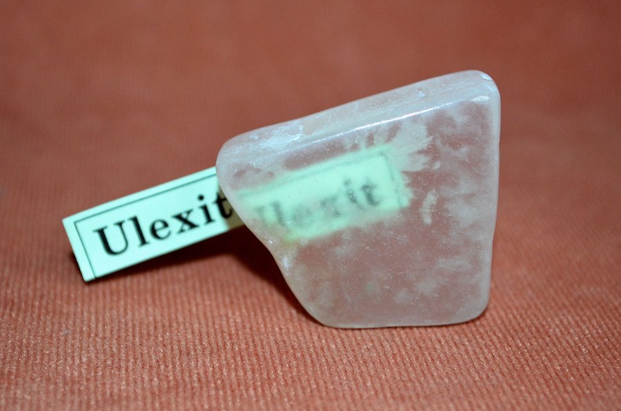Ulexit ásvány. Rostos szálas szerkezetű ulexit kristály halmaz Boron, Kalifornia lelőhelyről. Ritka nátrium és calcium tartalmú borát ásvány különleges optikai tulajdonsággal. Optikai vezetőképessége miatt TV kőnek is nevezik. A kristály alá helyezett írás a kristály tetején látszik. Keletkezése bór tartalmú evaporit képződményekhez kötődik.