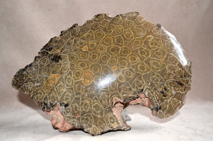Őskorall 150 millió évvel ezelőtt élt kövesedett maradványa a marokkói Atlasz hegységből. A teljes korall telep csiszolt és polírozott felületén tökéletesen látszik a korall telepeken ma is megfigyelhető szerkezet. Nagy méretű, különösen szép darab.