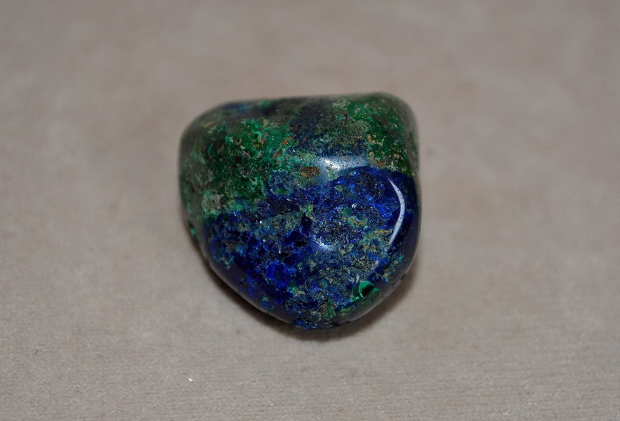 Azurit kristály csiszolt polírozott felülettel. Indigókék színű, réz-karbonát összetételű ásvány, melynek csiszolható, megmunkálható változata ritkaság. A zöld színű kísérő ásvány malachit.