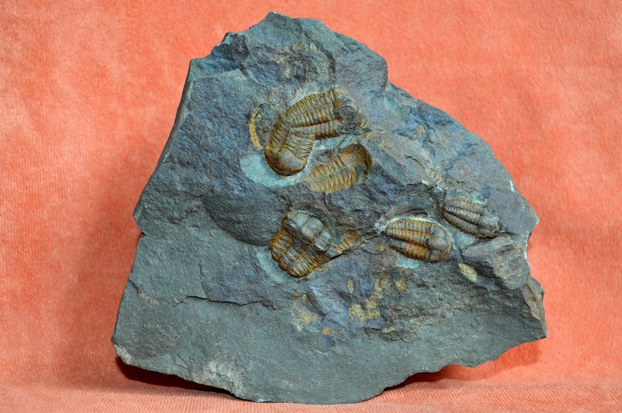 A ritka háromkaréjú ősrákokhoz tartozó Ellipsocephalus hoffi faj 510 millió éves kövült példányai a csehországi középső kambriumi Jince formációból. Viszonylag kisméretű ősrákok voltak 15-30 mm nagysággal, fejlemezükön szemek nem találhatóak, így feltehetően vakok voltak és a tengeri iszapa fúródva éltek, ott keresték táplálékukat. A perm időszak végén történt nagy kihalási hullám, amelyben egyébként a tengeri fajok mintegy 95%-a kipusztult, őket is lesodorta az élet színteréről. A bemutatott darab, mely 2 cm nagyságú egyedeket tartalmaz ennek a remek bizonyítéka, egy un. csatatér, ahol az elpusztult állatok tetemei nagy mennyiségben egymás mellett találhatóak. Pillanatkép az egykori tenger fenék aljzatáról. Ritkaság!