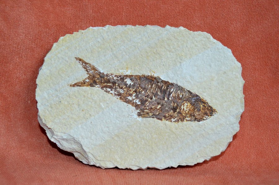 Knightia őshal a földtörténeti eocén korból. Mintegy 50 millió évvel ezelőtt a mai Észak Amerika területén tavakban és folyókban élt édesvízi halfaj egy példányának fosszílis maradványa finoman rétegzett aleurolit kőzetben. A ma élő heringgekkel és szardiniákkal van közeli rokonségban. Kiváló tartású fosszília, épségben fennmaradt és tökéletesen kivehető a gerincoszlop a csigolyákkal, a fej és az uszonyok is. Az egyed nagysága 9 cm. Pazar ritkaság! Lelőhely Green River formáció USA, Wyoming.