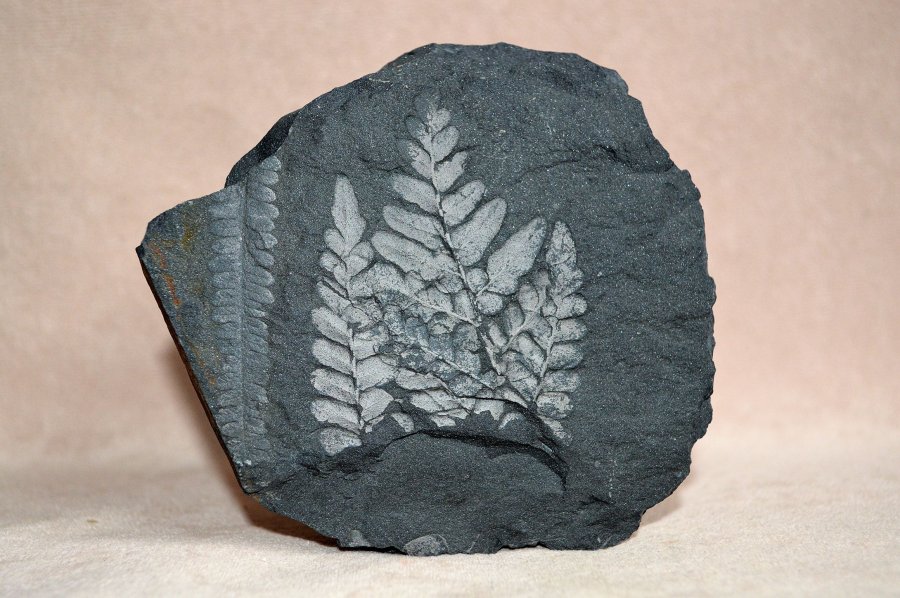Neuropteris kövület. A páfrányfélék családjába tartozó, mára kihalt Neuropteris faj megkövesedett levelei a 300 millió éves, karbon korú aleurolit kőzetben. Az egyes levelek mérete 1,5-2 cm. Lelőhely Piesberg, Németország.