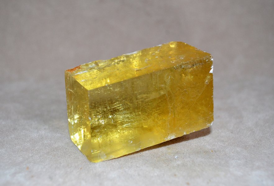 Nagy tisztaságú, enyhén sárgás színű, átlátszó izlandi pát (kalcit) ásvány romboéder alakú kristálya. Ezen az ásványon fedezték fel és ezen figyelhető meg, illetve tanulmányozható legjobban a kettőstörés jelensége, mely az ásványtanban meghatározó jelentőségű optikai vizsgálatoknak az alapja. A kiváló szépségű, tökéletes szimmetriájú kristály mérete 5x3x2,5 cm.