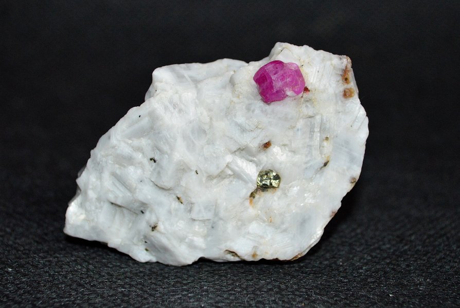 Rubin ásvány pompás színű, drágakő minőségű, 1 cm átmérőjű kristálya metamorf eredetű márványban. A kristály nagysága 1 cm, kísérő ásványok pirit és muszkovit. Lelőhely Aliabad Pakisztán.