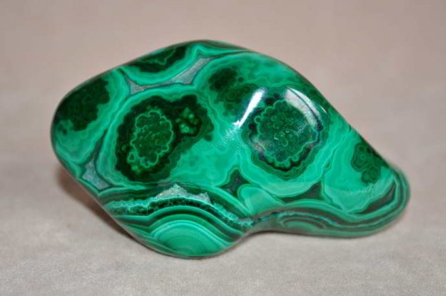 Malachit ásvány kiváló rajzolatú, rendkívül dekoratív, cseppköves-gumós kialakulású változata csiszolt, polírozott felülettel. A darab súlya 150 gramm, mérete 8,5x5x2,5 cm.
