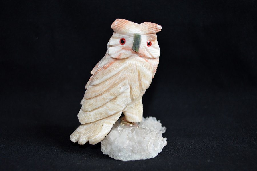 Aragonit ásványból faragott, egyedi kézi készítésű bagoly figura. Alapja perui hegyikristály, teste vörösbarna sávos aragonit, orra jáde kőből készűlt.